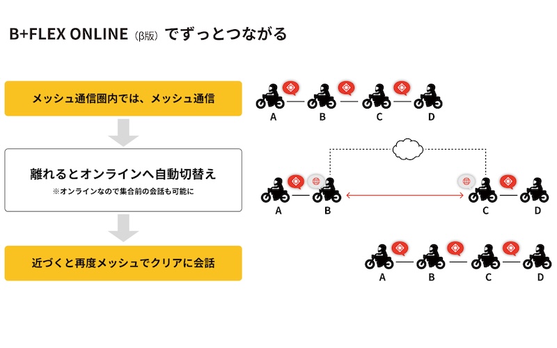 「B+COM 7X EVO」はメッシュ通話とオンライン通話を自動的に