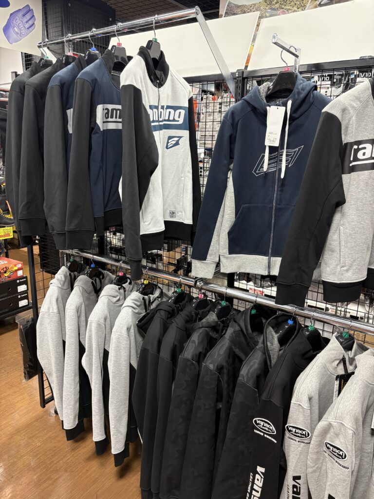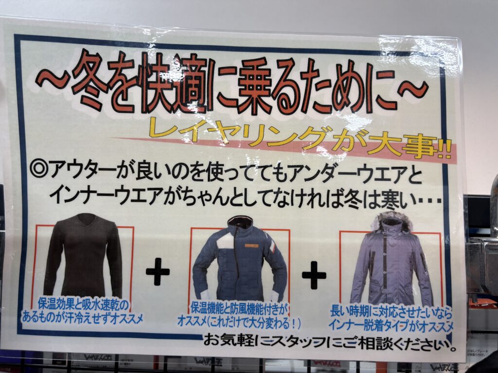 店内のPOPにもあるように「レイヤリング」が冬のライディングを快適にするのには