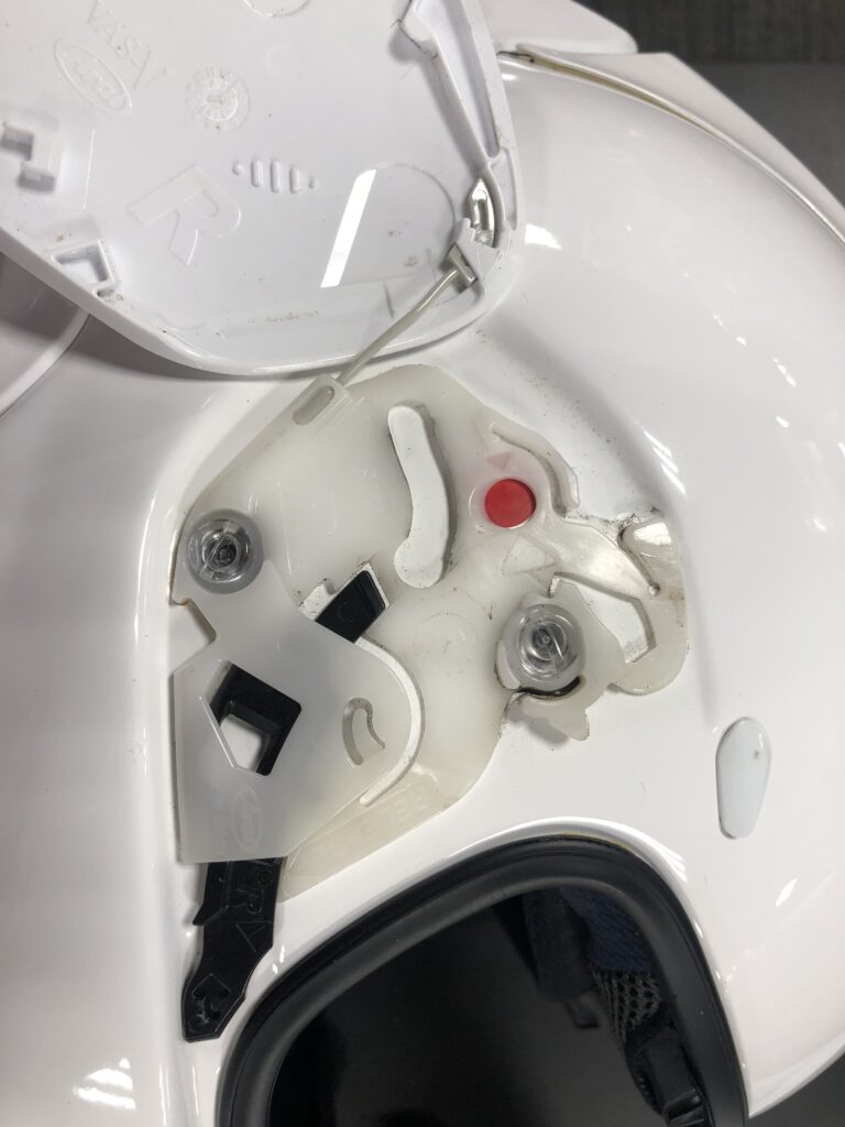 綺麗にしてヘルメットやシールドに付属しているシリコンオイルを綿棒かなんかで可動部に塗布してみるとびっくりするくらい動きがよくなります!