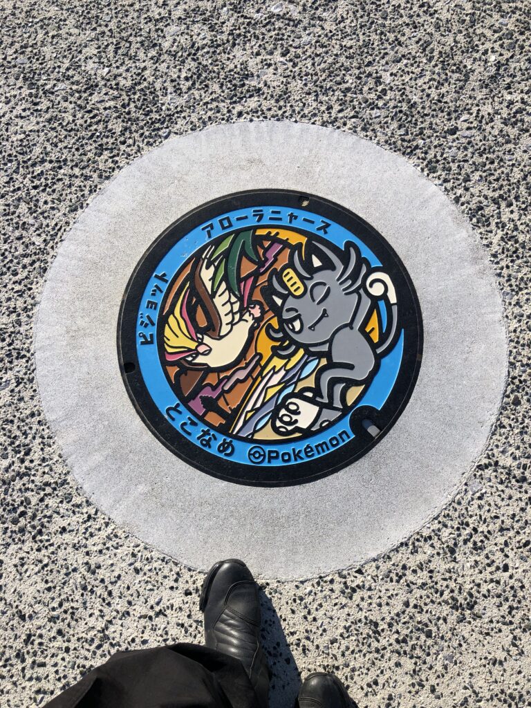お腹を満たしたら常滑の方まで登っていき…りんくうビーチで有名なポ○モンのマンホールを見つけました!iPhoneのマップを見るとちゃんと載っているんですねぇ~実物がこちらいろんなところにあるみたいでこのマンホール目当てのツーリングとかも面白そうですよね!